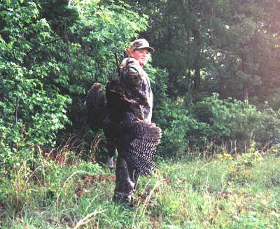 OK, OK, what do you do when you start struggling? You fall back on some of your more faithful places and set-ups. I traveled to Hillsboro to hunt the Cullum farm. I had tried to save this for my 2 sons, but I really need a confidence builder to get this season started. I set up at the usual place, far across the first creek on the border of the second. At first light I heard a gobble far in the distance across the creek so I felt that the best position was up on the hill across the creek. I made my way to the spot where Chase had killed his first gobbler 2 years ago. After beginning to call I could tell that the gobbler was heading the other way. After a while I heard a gunshot in that direction, so I figured my chance for him was now pretty slim. Unsatisfied with the set up, I relocated back down into the bottom where I had killed the nice gobbler the year before. I spooked three hens on my way and was a little frustrated at this but planned to spend enough time for it to settle down anyway. After setting up I gave it a half-hour before I started calling. Immediately I heard a gobble and where would you think it was? Right up there on the hill where I had just come from. It never fails, if you plan to move you should probably not or at least give it half hour to an hour after last calling. Well now under any other circumstances my task would be almost impossible - calling a gobbler down hill and across a creek, but on the Cullum farm I come to accept is as the norm. I called again and I immediately was cut off by what now appeared to be two gobblers. I started the camera running and in no time saw the birds making their way down the hill toward the creek. I finally picked them up in the camera and begin to ready my gun for a shot. The creek was about 75 yards. As they approached the first bird started down the opposite bank into the creek so I decided to flip the viewfinder eyepiece up so that I could back away from it. As the second bird followed I had lost track of the first and when I looked at the camera and then back at the creek, I saw that he had made me. Standing alert now on the near side bank he wasn't coming any farther. Although I had 5 decoys between them and me he knew that something wasn't right. They did an about face and went back the way they had come. I only moved my hand and the viewfinder about six inches! Was it that movement or the glare from the lens, I guess I'll never know. Although I should have, I didn't go out to the creek and look back at my set up to try to determine this. Another frustrating hunt. This videoing seems to be getting harder every year rather than easier, maybe the birds are getting wiser. Yea, that's it, the birds must be seeing a lot of hunters with video cameras. Like I said, you must find a cause and corrective action each time you fail, at least for that particular incident. It just seems that I'm running into a lot of different incidents.